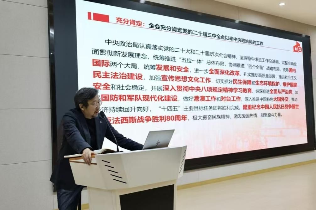 12月11日下午,副校长张炼在A12-115报告厅,以《学习贯彻党的二十届四中全会精神》为题,为师生讲授了一堂主题鲜明、内涵丰富、指导性强的主题党课,分管部门和联系单位的全体教职工、学生党员、学生干部约200余人参加学习。此次党课旨在引导广大师生准确把握全会精神的核心要义,切实把思想和行动统一到党中央决策部署上来,推动全会精神在艺术教育一线落地生根。